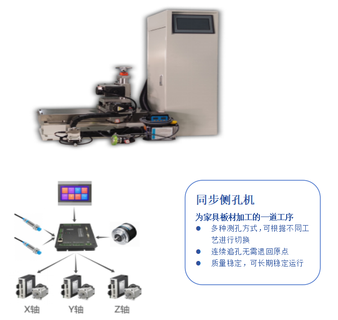 同步侧孔机是一种用于物体进行侧面孔洞或开凿加工的机械设备,侧孔机可直接实现智能定位准确打孔完成生产,是传统排钻打孔速度的两倍以上;其机器运算速度快、性能稳定。