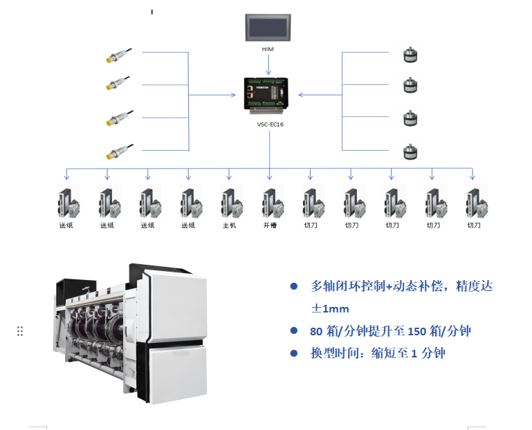 本方案采用高性能总线运动控制器为核心,结合伺服电机、高精度编码器及人机交互界面(HMI),构建智能化纸箱开槽系统。通过软件算法实现多轴协同控制,显著提升设备性能与灵活性。